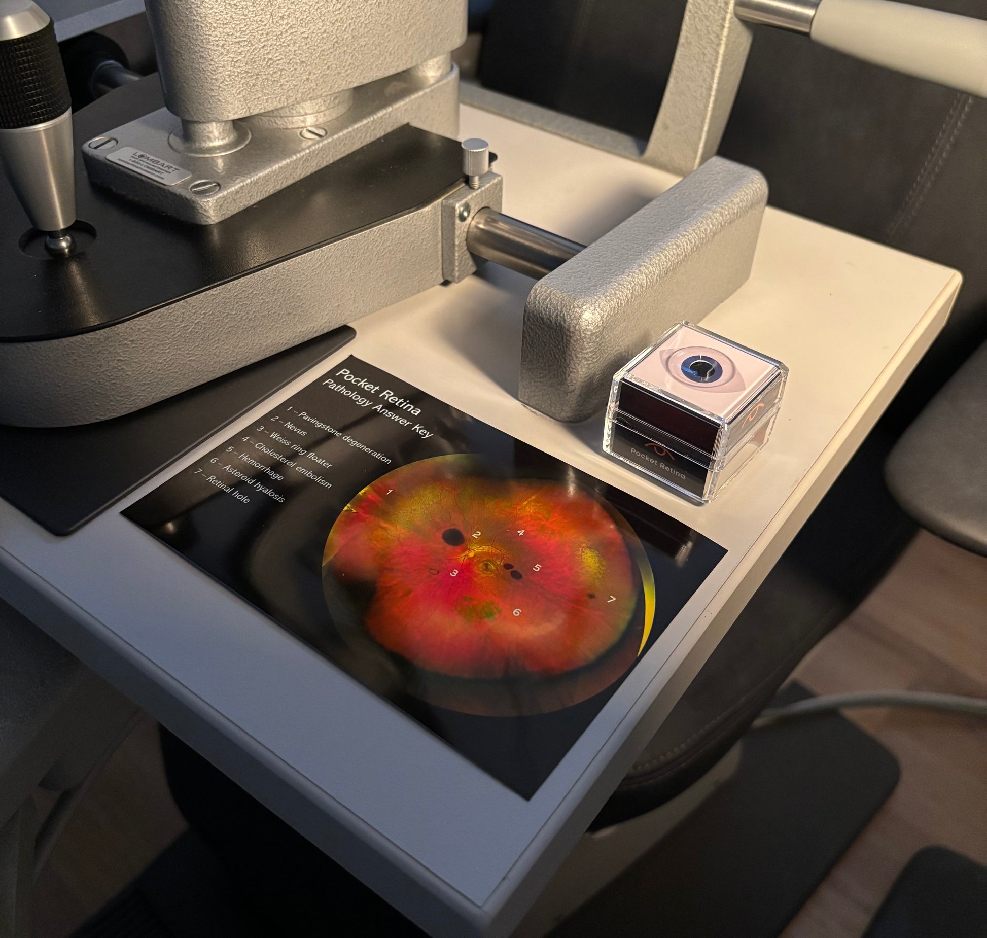The Pocket Retina provides both slit-lamp and indirect retinal examination practice, allowing for a broader retina examination up to the far-periphery. This model has near-realistic color resolution of the retina and features a variety of pathologies in the posterior pole, mid-periphery, and far periphery.